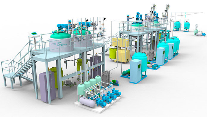 鎮(zhèn)田自動溶膠配料系統(tǒng)配置小袋投料站、真空上料系統(tǒng)、自動脫泡系統(tǒng)、熱水循環(huán)系統(tǒng)、全自動CIP工作站、雙攪拌化膠罐、高速攪拌配料罐。