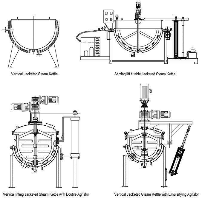 Jacket kettle can be fixed structure or tiltable structure, also can add mixing device and emulsification device according to customers’ requirements.